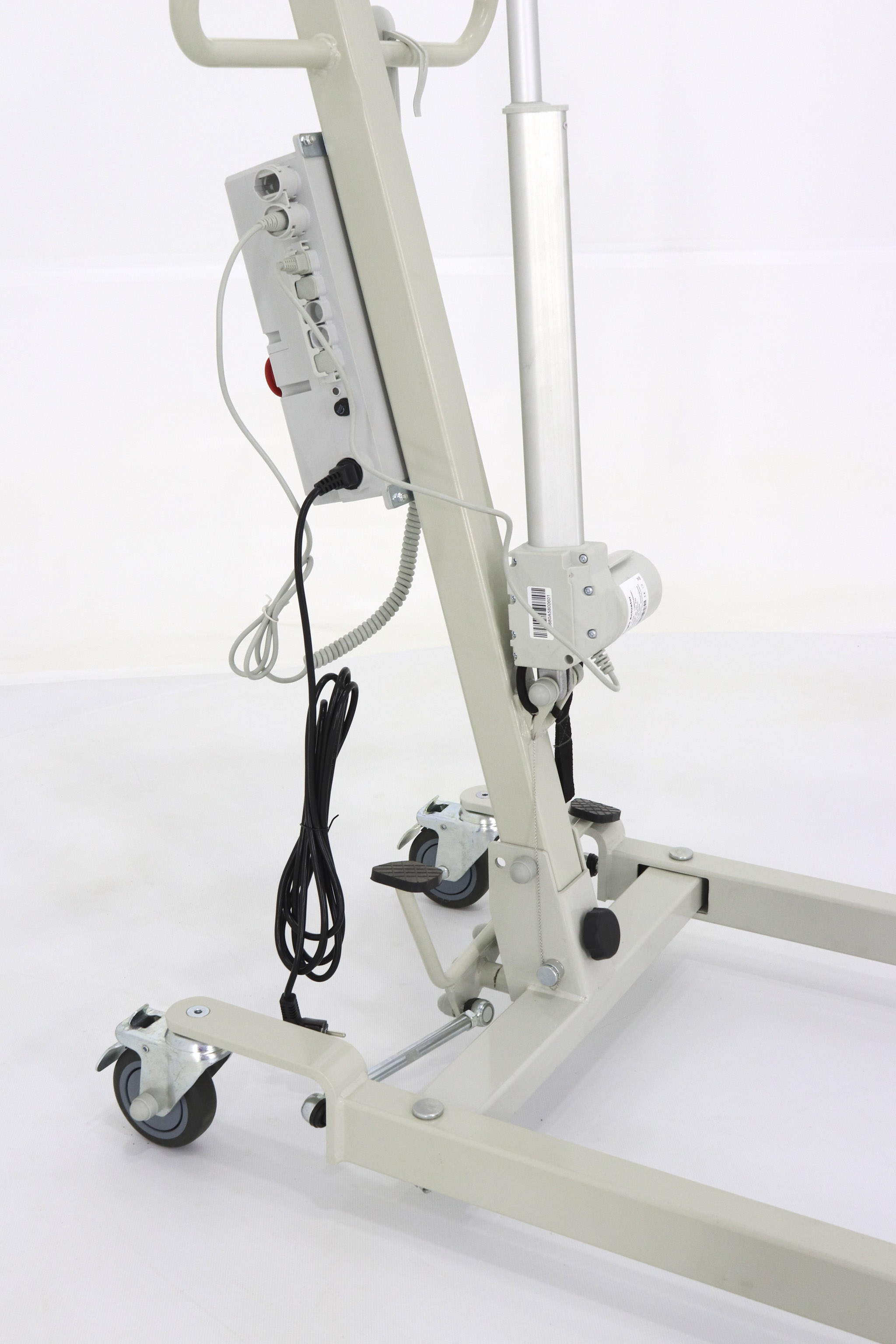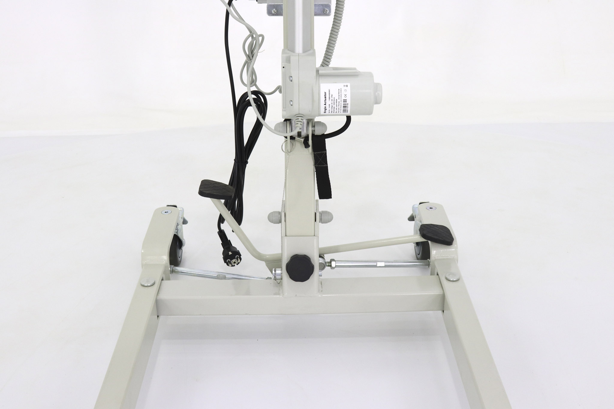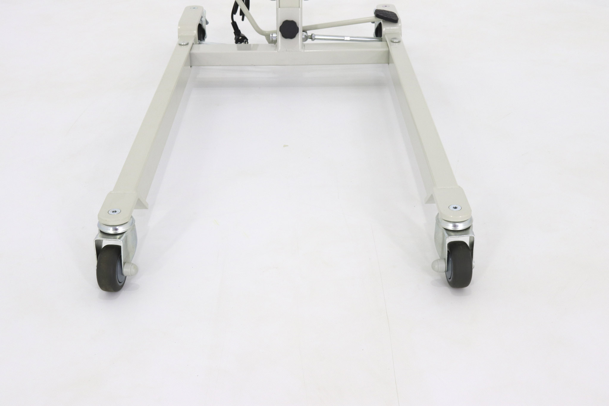 Устройство имеет низку раму высотой 120 мм, поэтому устройство легко может подъезжать даже к низким кроватям или любой другой мебели. Ширину опорных лам вы можете регулировать при помощи специальной педали. Подъемник может приподнимать человека с уровня пола на высоту 900 мм.